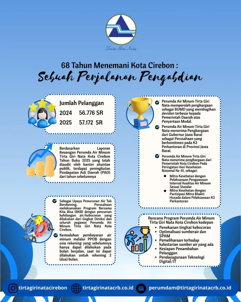 Di tengah suasana Ramadan yang penuh berkah, Perumda Air Minum Tirta Giri Nata Kota Cirebon kini genap berusia 68 tahun. Namun bagi kami, usia bukanlah tentang perayaan, melainkan tentang tanggung jawab yang lebih besar.
