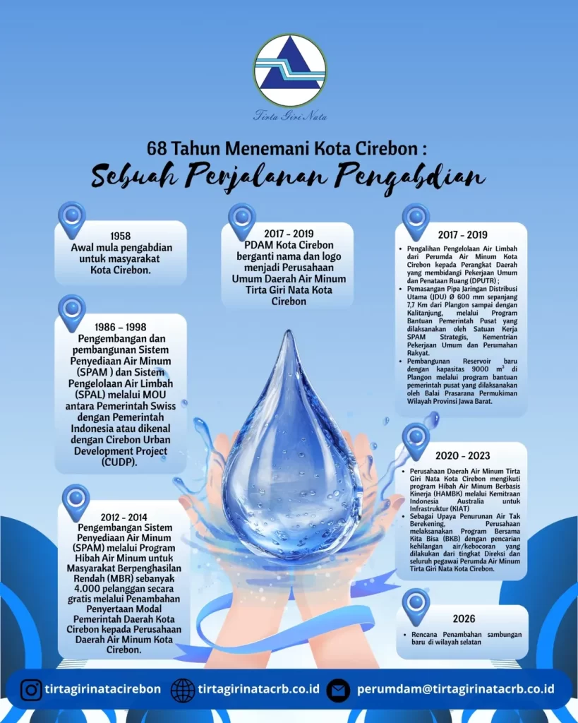 Pernahkah terpikir bagaimana air mengalir ke rumah kita ? Melewati berbagai dekade, Tirta Giri Nata terus bertransformasi. Menemani warga Kota Cirebon. Dari masa ke masa, komitmen kami tetap sama: Memberikan pelayanan terbaik untuk masyarakat.