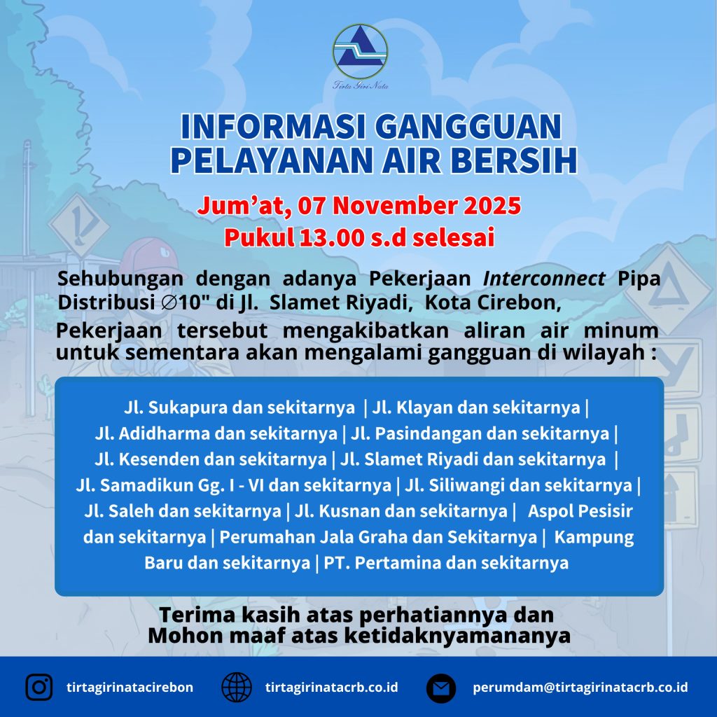 Bersama ini kami umumkan kepada Masyarakat Pelanggan Perumda Air Minum Tirta Giri Nata Kota Cirebon bahwa akibat pekerjaan tersebut, akan terjadi gangguan aliran air (melemah hingga tidak mengalir) di beberapa wilayah terdampak sebagaimana lokasi dan jadwal terlampir. Berkenaan dengan hal tersebut, kami himbau kepada para Pelanggan Perumda Air Minum Tirta Giri Nata Kota Cirebon yang berada di wilayah tersebut untuk melakukan persiapan agar dapat melakukan aktivitas sehari-hari.