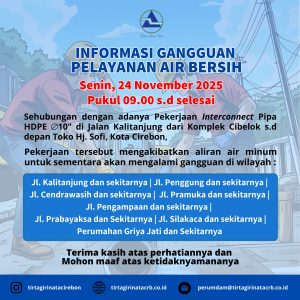 ✨ INFORMASI GANGGUAN✨ Sehubungan dengan adanya Pekerjaan Interconnect Pipa HDPE ⌀10″ di Jalan Kalitanjung dari Komplek Cibelok s.d depan Toko Hj. Sofi, Kota Cirebon,, Bersama